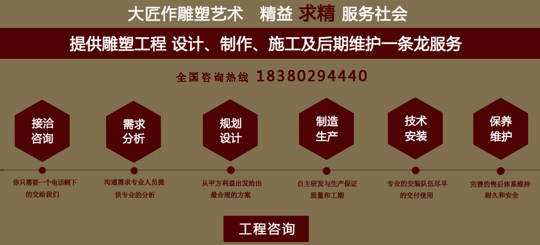 成都大匠作雕塑有限公司,是經(jīng)成都工商局審定注冊的正規(guī)專業(yè)雕塑制作及工程安裝服務(wù)機構(gòu),是由一群年輕富有朝氣的年輕人創(chuàng)辦,發(fā)軔于四川省成都市龍泉驛區(qū)。它是一家******于創(chuàng)作、制作和銷售為一體的公司。大匠作擁有多年從事公共藝術(shù)的專業(yè)人員和雕塑制作人組成的核心團隊,為您提供專業(yè)、具創(chuàng)新的設(shè)計及制作服務(wù)。公司成立以來,秉承“******服務(wù)、誠信為本”的宗旨,以客戶需求為目標導(dǎo)向,不斷學(xué)習,進取,優(yōu)化和提高服務(wù)質(zhì)量,公司向您******——“您的滿意***是我們的信譽”,我們將以飽滿的熱情和******的服務(wù)贏得您的贊譽和支持。 愛心,細心,耐心,責任心是我們的要求,盡心盡職,為您打造出創(chuàng)新、專業(yè)、******的設(shè)計方案,我們堅信先做人、后做事,用心對待客戶,實行透明收費,人性化服務(wù),本著對客戶負責,對客戶負責,更是對自己發(fā)展負責的態(tài)度,爭取做到讓每位客戶滿意